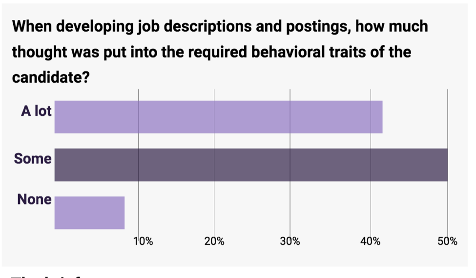 Think of it this way. All jobs have requirements. There are benchmarks that define the role. It is very likely that Bob and Mary are shining so brightly because they are wired in such a way that it matches the benchmarks of the role that they’re in. Yet, many organizations (less than 50%) give much thought to behavioral traits. Almost 40% of survey respondents say their job postings usually don’t describe the behavioral traits they’re looking for in a candidate.
