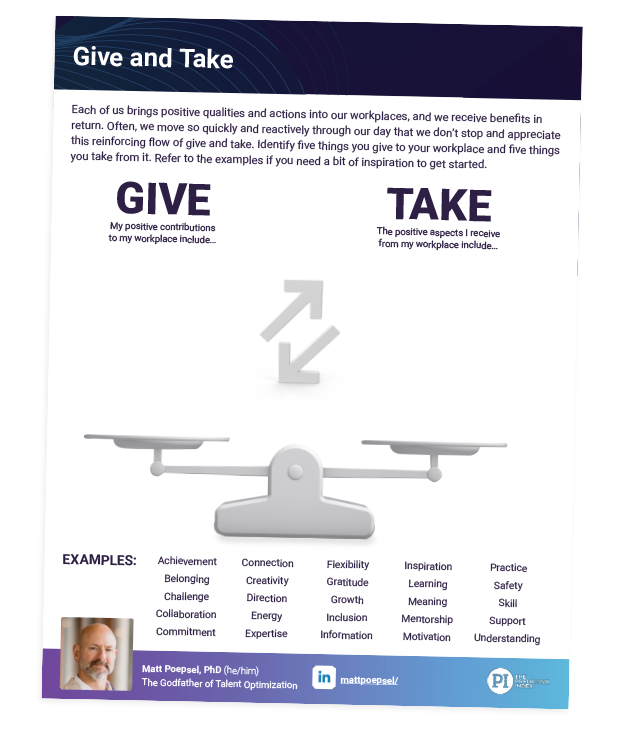 It can be easy to lose sight of this reciprocity due to the demands of day-to-day work. That’s why I’ve created this simple worksheet to help you recall all that you give and all that you receive when it comes to your work. Complete it for yourself to rekindle your relationship with your workplace. Then share it with your team members to help them do the same.