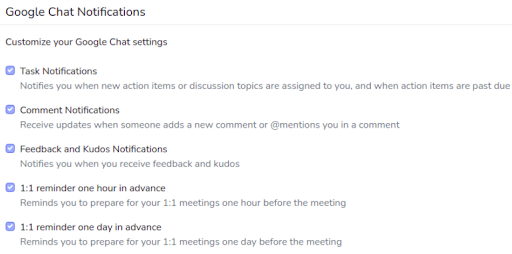 - Google Chat notifications: Receive Perform updates directly in your Google Chat channels.