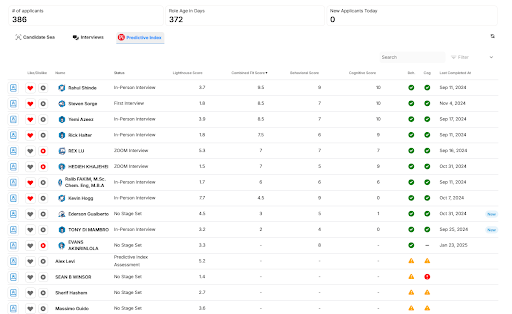 Dedicate Predictive Index tabs allow you to review candidates who have completed their assessment, view their reports, and move them into new stages within the process.