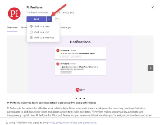 - One-click install: Connect from either Perform or the Microsoft Teams app store.