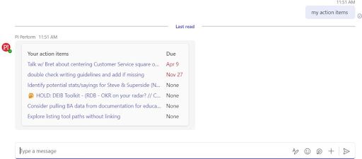 Keep your team aligned and in motion by connecting Microsoft Teams to PI Perform. The integration delivers real-time notifications and lets you manage action items directly from Teams—helping teams stay on top of priorities, share updates, and manage tasks without context switching.