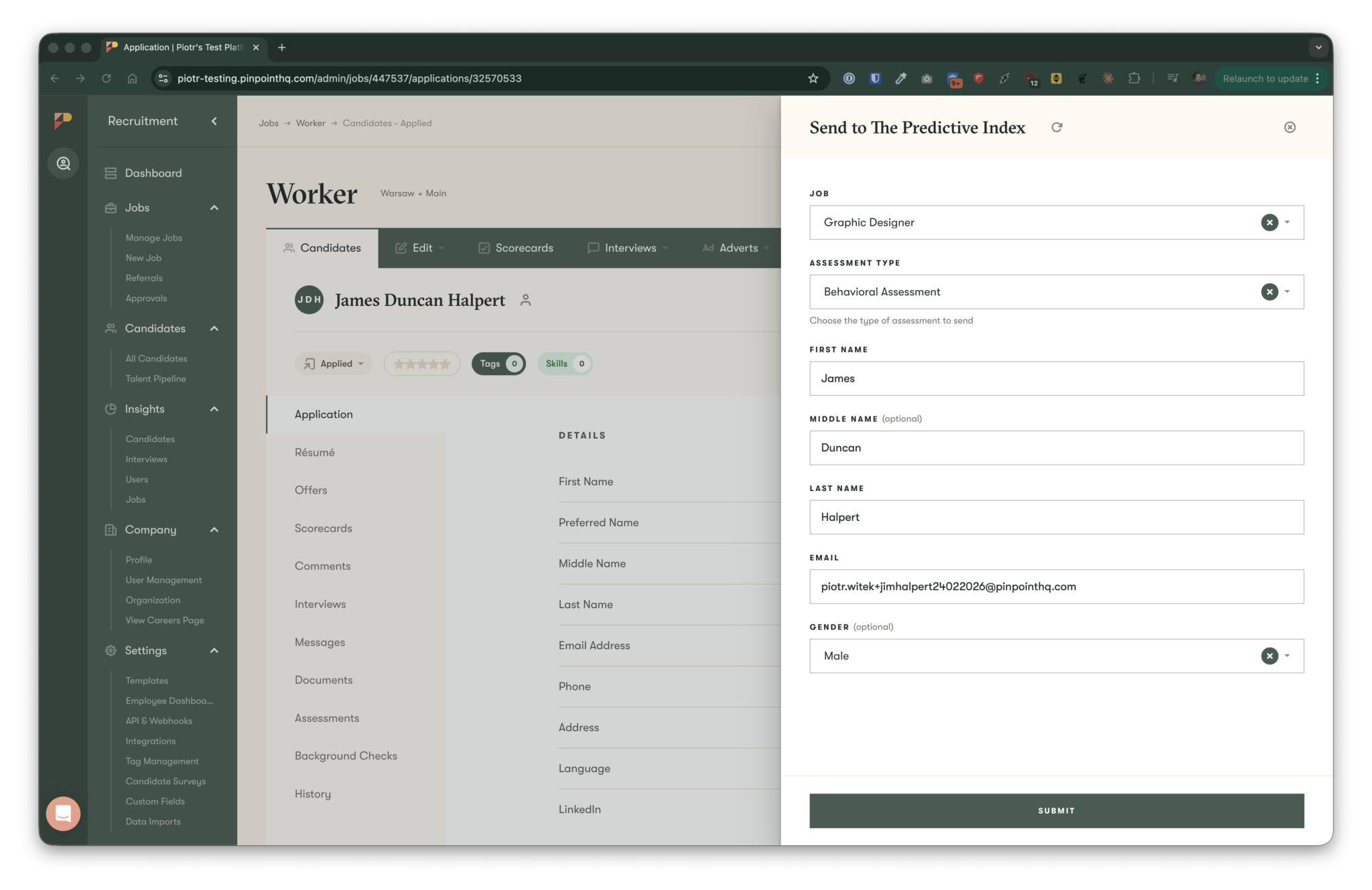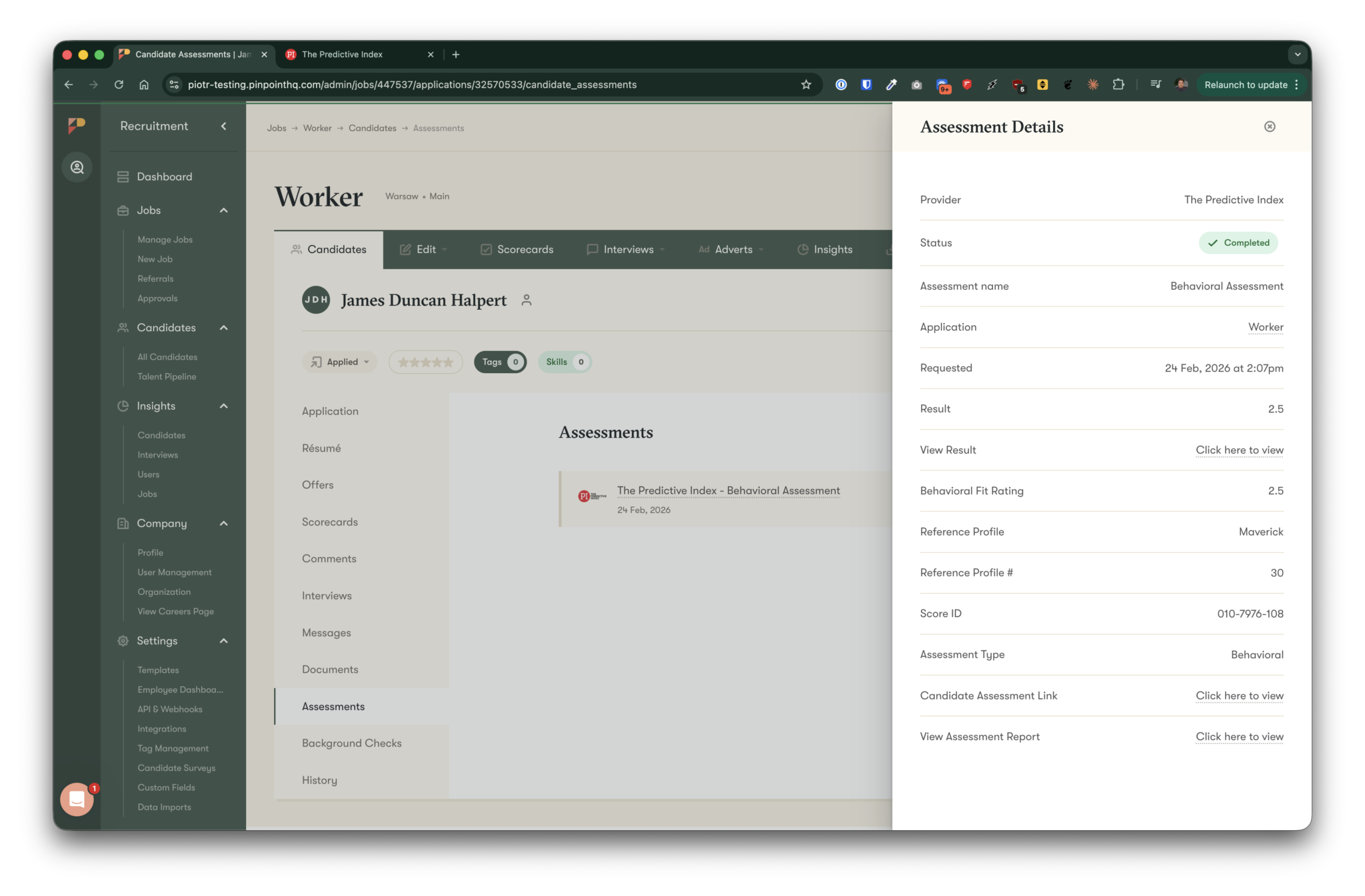 Recruiters can invite candidates to complete Predictive Index assessments without leaving their ATS. This removes friction, reduces admin, and ensures assessments are consistently applied at the right stage of the hiring process.