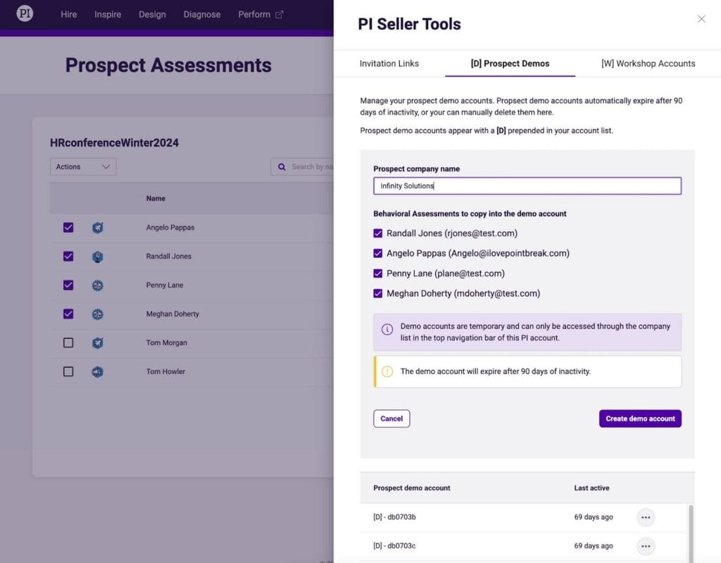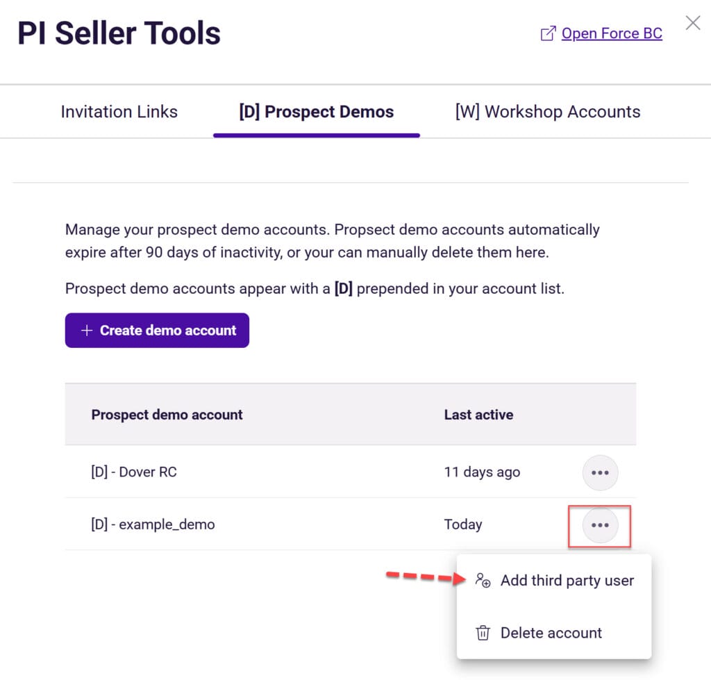 Important: This feature is intended for internal sharing only. You can only share demo and workshop accounts with users who are also members of your PI2 Seller Account.