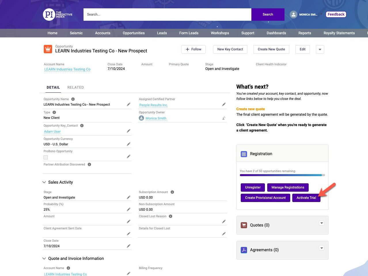 In ForceBC, locate the registered opportunity and select Activate Trial.