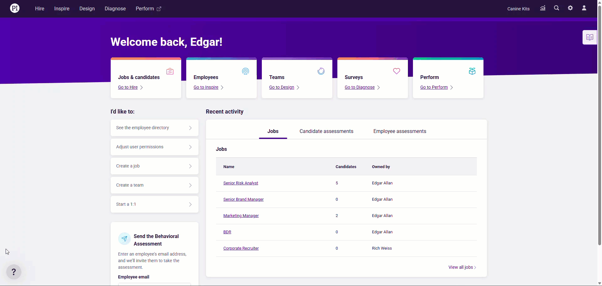 Hire allows you to create behavioral and cognitive job targets, screen for potential candidates, and generate interview questions to confirm that alignment.