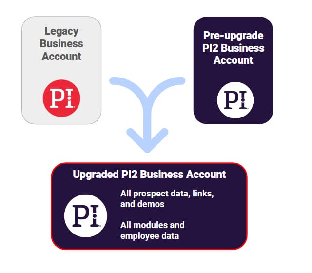 Until your Legacy Business account is upgraded, you will have access to both your Legacy Business Account and your Pre-upgrade PI2 Business Account. When the Business Account upgrade is complete, these accounts will be merged into one fully functioning, upgraded PI2 Business Account.