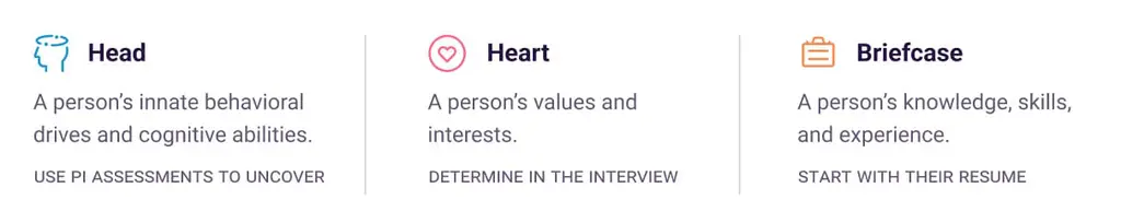 It’s important to always remember that a job candidate is more than a list of experiences, education, and references on a piece of paper. To better understand their fit for a job, assess their behavioral drives and cognitive ability (head), their values and interests (heart), along with their knowledge, skills, and experience (briefcase).
