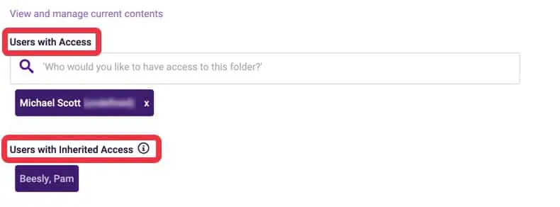 If a user was given access to a higher level subfolder, they will automatically be given access to any subfolders within that higher level subfolder. These users will be listed as ‘Users with Inherited Access’.