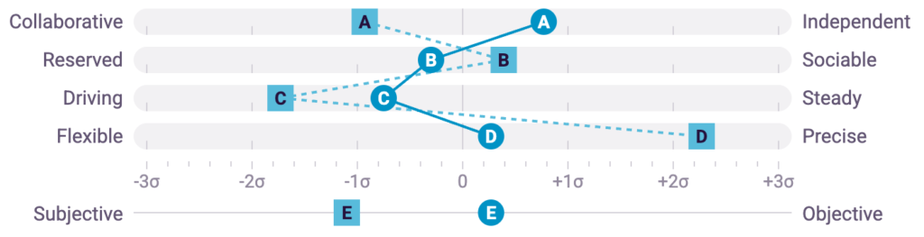 Seeing the differences is not enough to make assumptions or jump to any conclusions. The next step is always having a conversation with the employee. The data facilitates conversations around self-awareness, growth, stretching behaviors, or enhancing/improving an individual’s understanding of their role, their team, and what is expected of them at work.